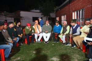 केदारनाथ विधानसभा के सौडी गांव में उपचुनाव भाजपा प्रत्याशी के समर्थन में आयोजित सूक्ष्म सभा में पूर्व सैनिकों के साथ चुनावी चर्चा करते सैनिक कल्याण मंत्री गणेश जोशी।