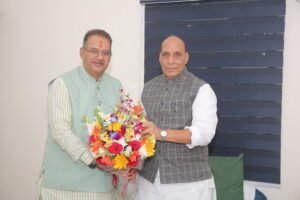 रक्षा मंत्री राजनाथ सिंह से शिष्टाचार भेंट कर उन्हें दीपावली की बधाई एवं शुभकामनाएं सैनिक कल्याण मंत्री गणेश जोशी ने दी